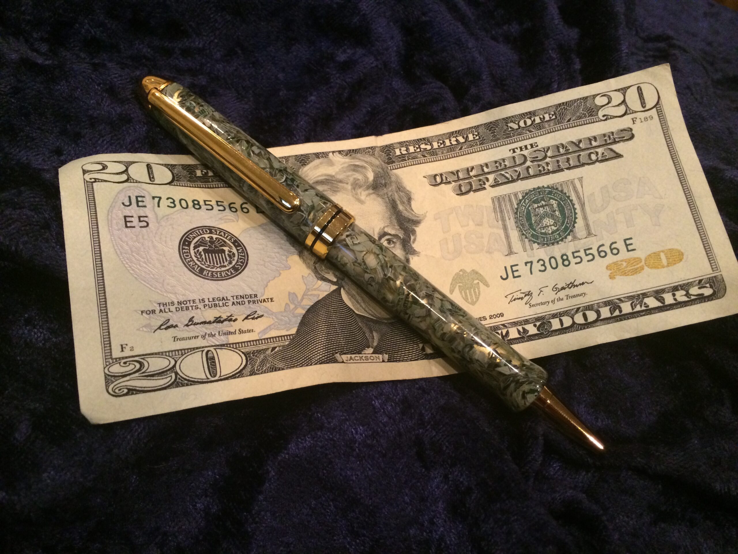“Cash Is King” is our Cross® type ballpoint twist pen handcrafted from an acrylic composite of real shredded cash. You’ll never leave home again without having a pocket full of money! Finished with our beautiful High Gloss finish and 24k Gold plate pen hardware.